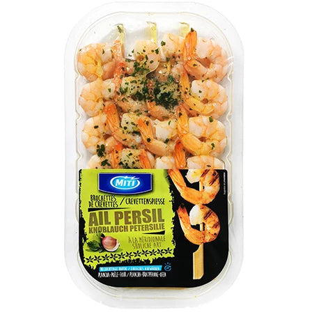 MITI Szaszłyki z krewetek gotowane częściowo obrane w sosie czosnkowo-pietruszkowym 125 g